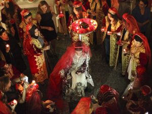 Düğün ilahileri eşliğinde gelinimiz ortaya alınır ve etrafında def çalarak ilahi söylenir. Bu görsellik ile ara ara gelinimizin elinden tutularak, davetlilere selam vermesi sağlanır..
