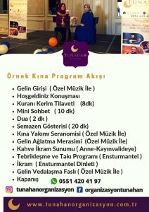 İslami Kına Organizasyonumuza teşrif eden misafirlerimize, Aileler, gelinimiz ve İslami Organizasyon Firması adına hoş geldiniz konuşması yapılır.